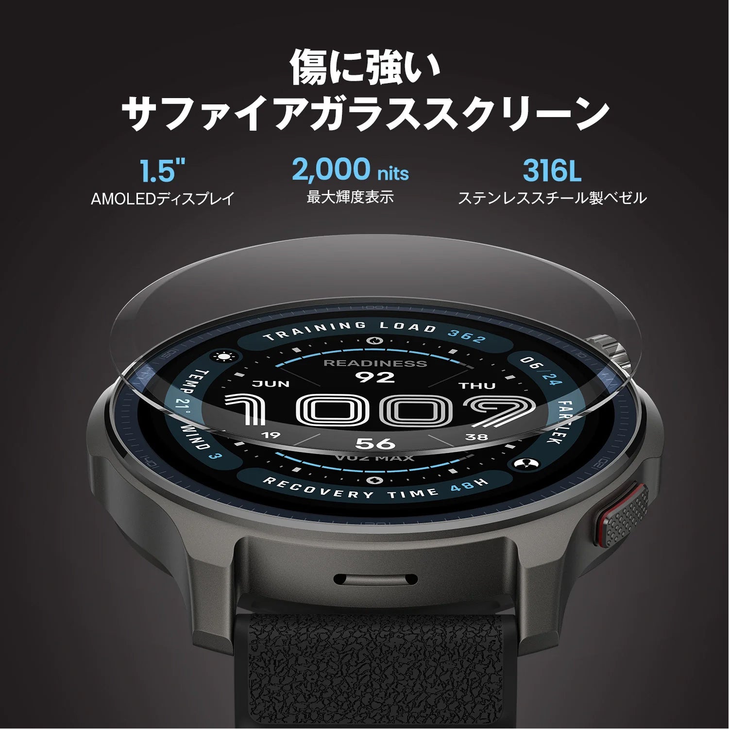 傷に強いサファイアガラスをスクリーンに採用。47.5mmの大きなディスプレイは2000ニトの高輝度AMOLEDを搭載。どんな過酷な環境でも、必要なデータを一目で確認できます。