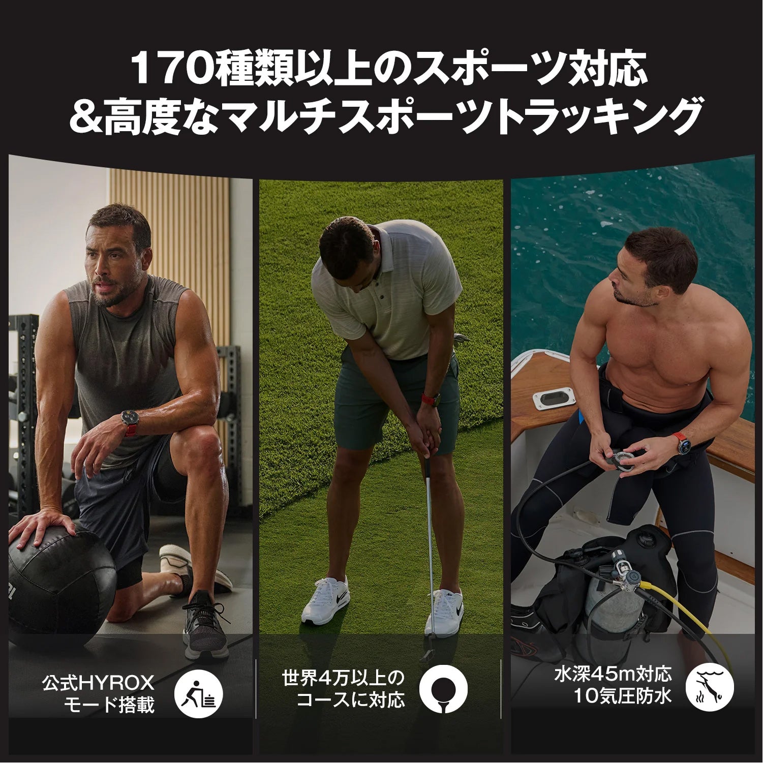 10ATMの耐水性能に加え、45mまでのダイビング認証を取得。フリーダイビングからスキューバまでサポート。