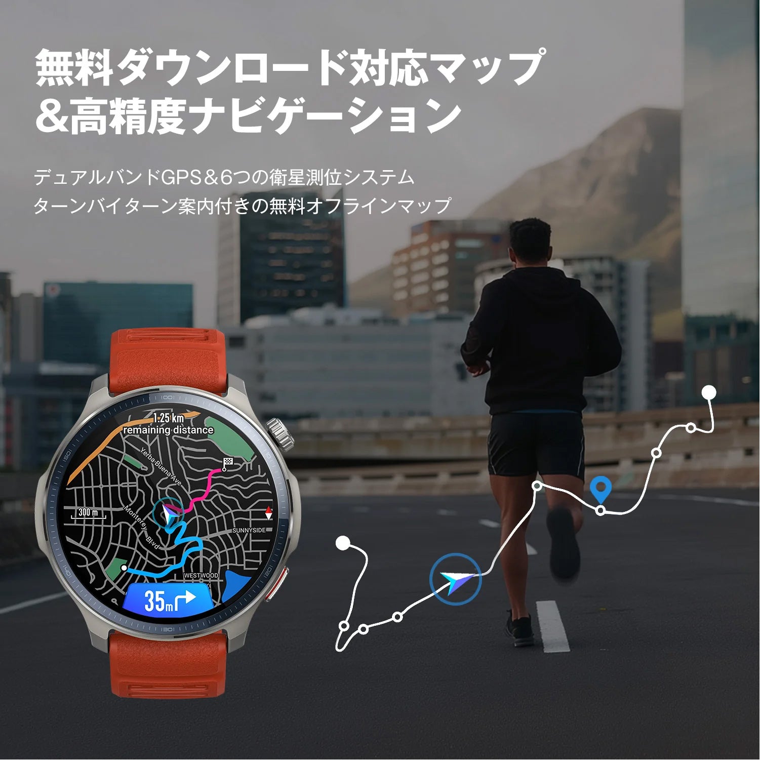 高層ビルの谷間や木々が生い茂る森の中でも、あなたの一歩一歩を正確に記録。デュアルバンド対応と6つの衛星測位システムにより、スピーディーで安定した測位を実現します。本格的なトレイルレースでも安心して挑めます。オフラインマップを無料でダウンロードして
