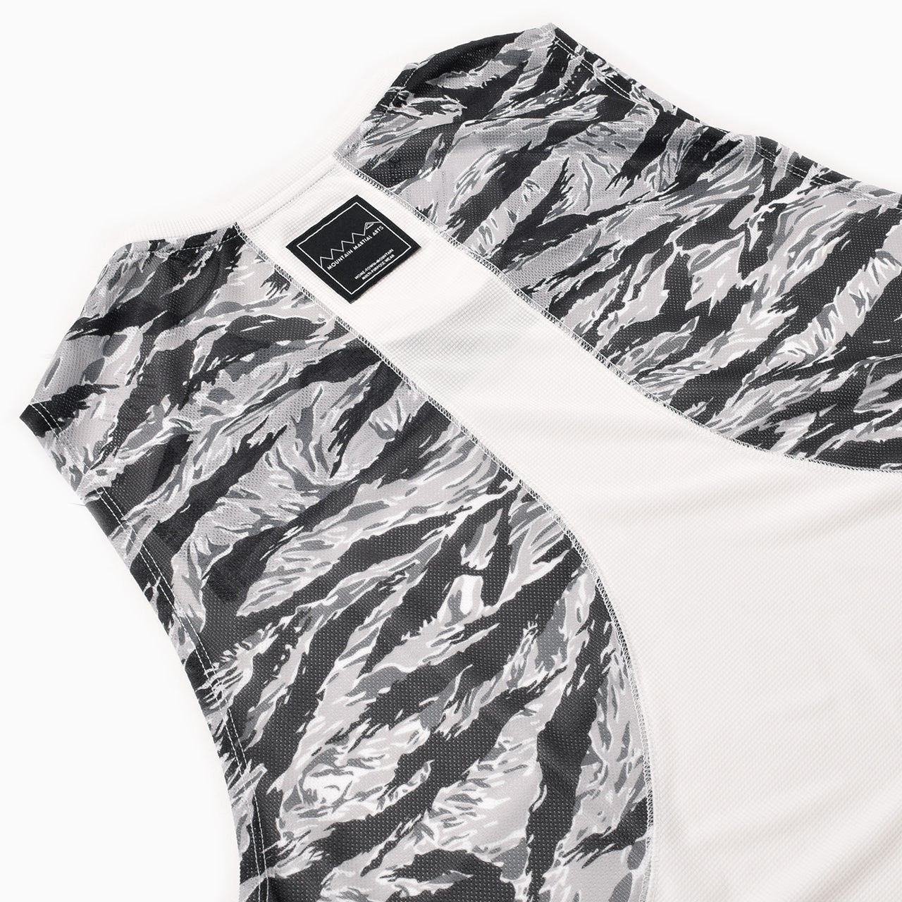 日本製のオリジナルボディは、胸部と背面の肩甲骨部を COOLMAX® の速乾メッシュで切り替え、通気性を向上。オリジナルタイガーカモを昇華転写プリントしている。肩甲骨に沿った切り替えは腕振りを遮ることなく、ランニング時の肩周りの動きをスムースに。