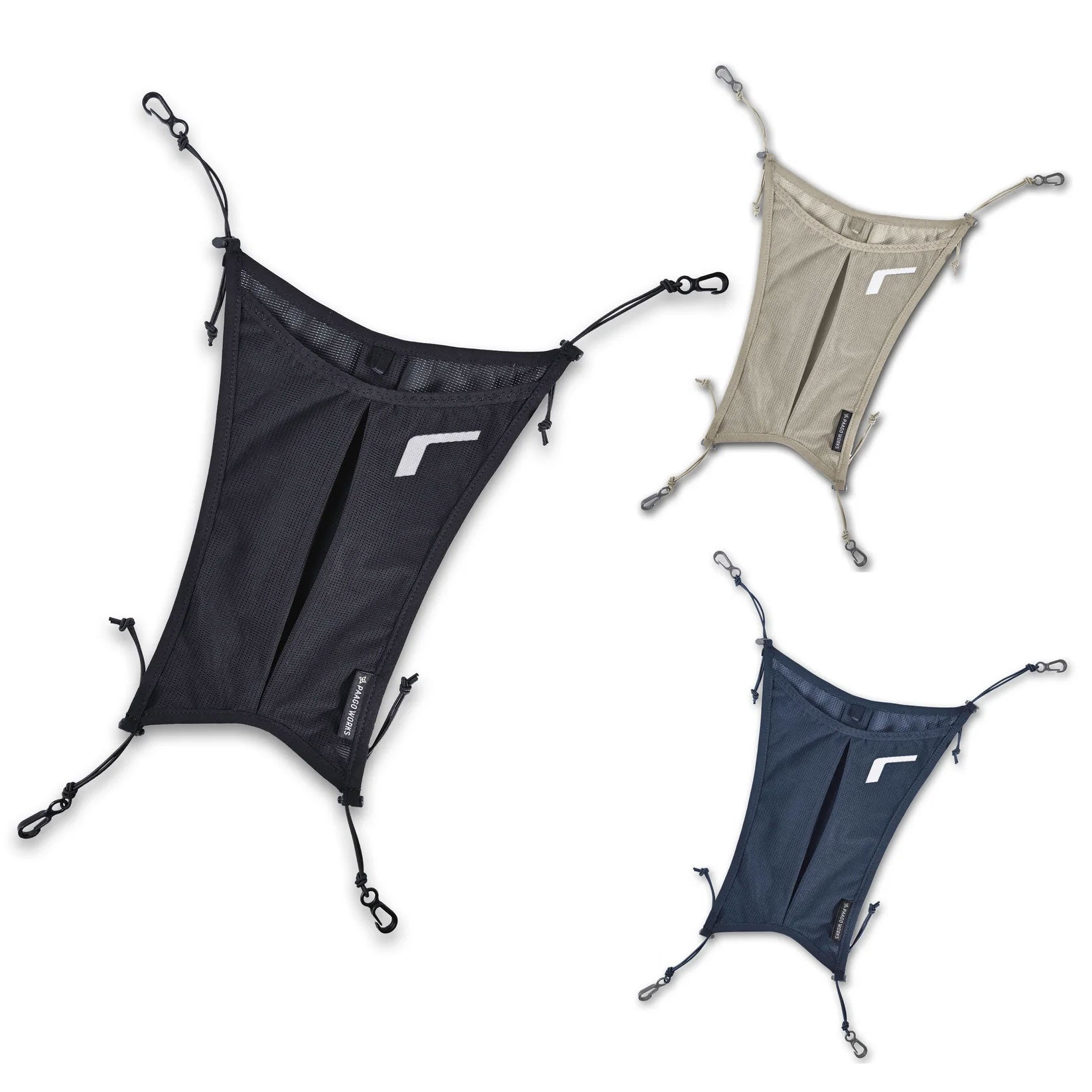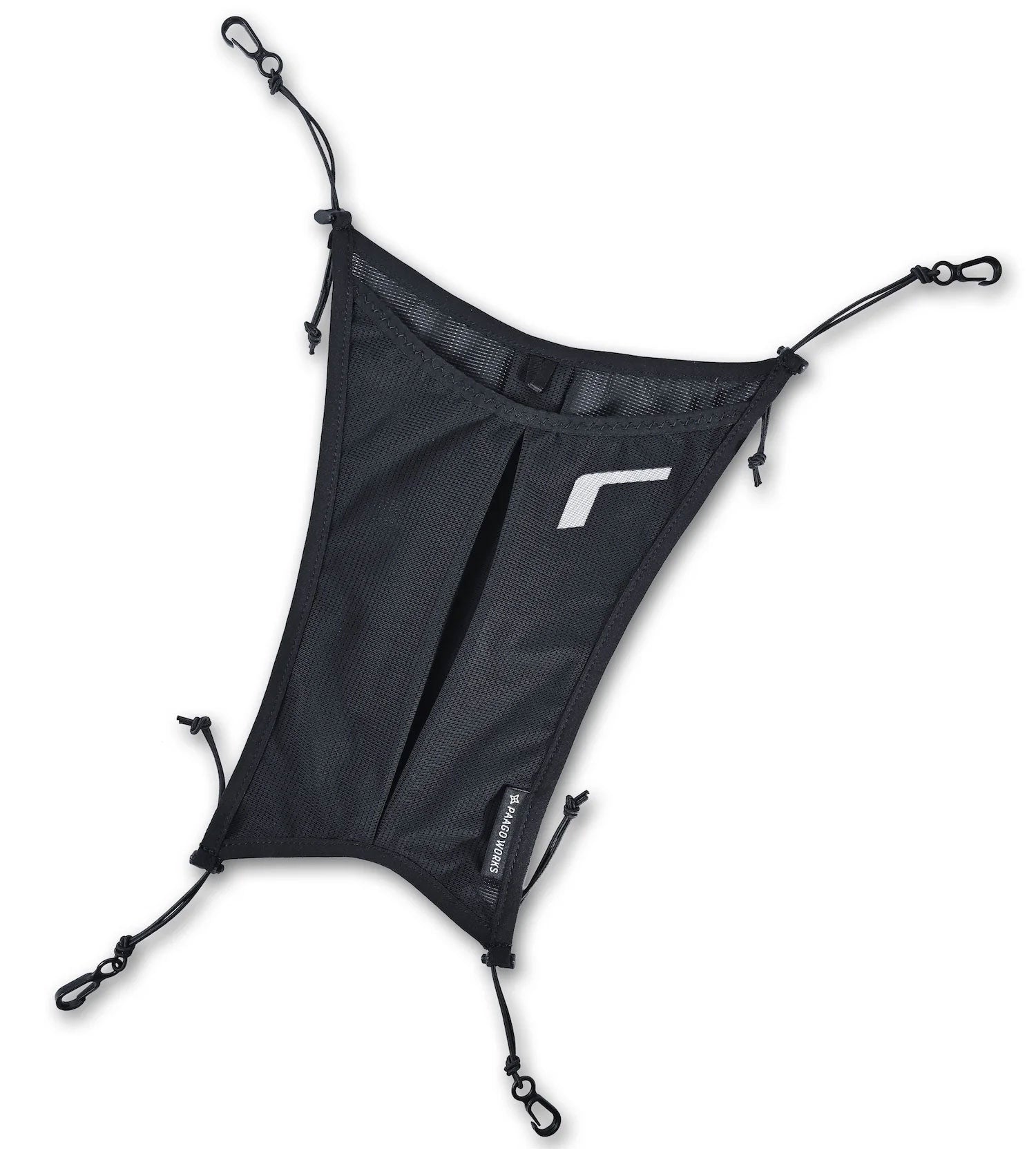 ストレッチメッシュとショックコードにより柔軟性に優れており、ヘルメットの外付けなどが可能です。(動画はRUSH11R)ロゴ部分は反射素材になっています。